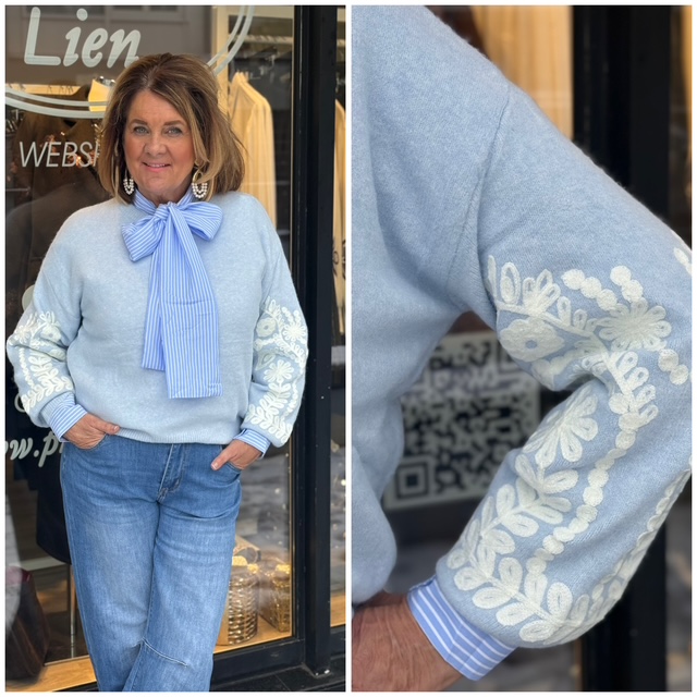 Trui Leo zacht blauw met embroidery mouw
