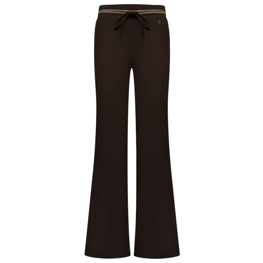 De blazer is een kort model, hierdoor valt hij mooi op de broek met gouden bies in de taille.