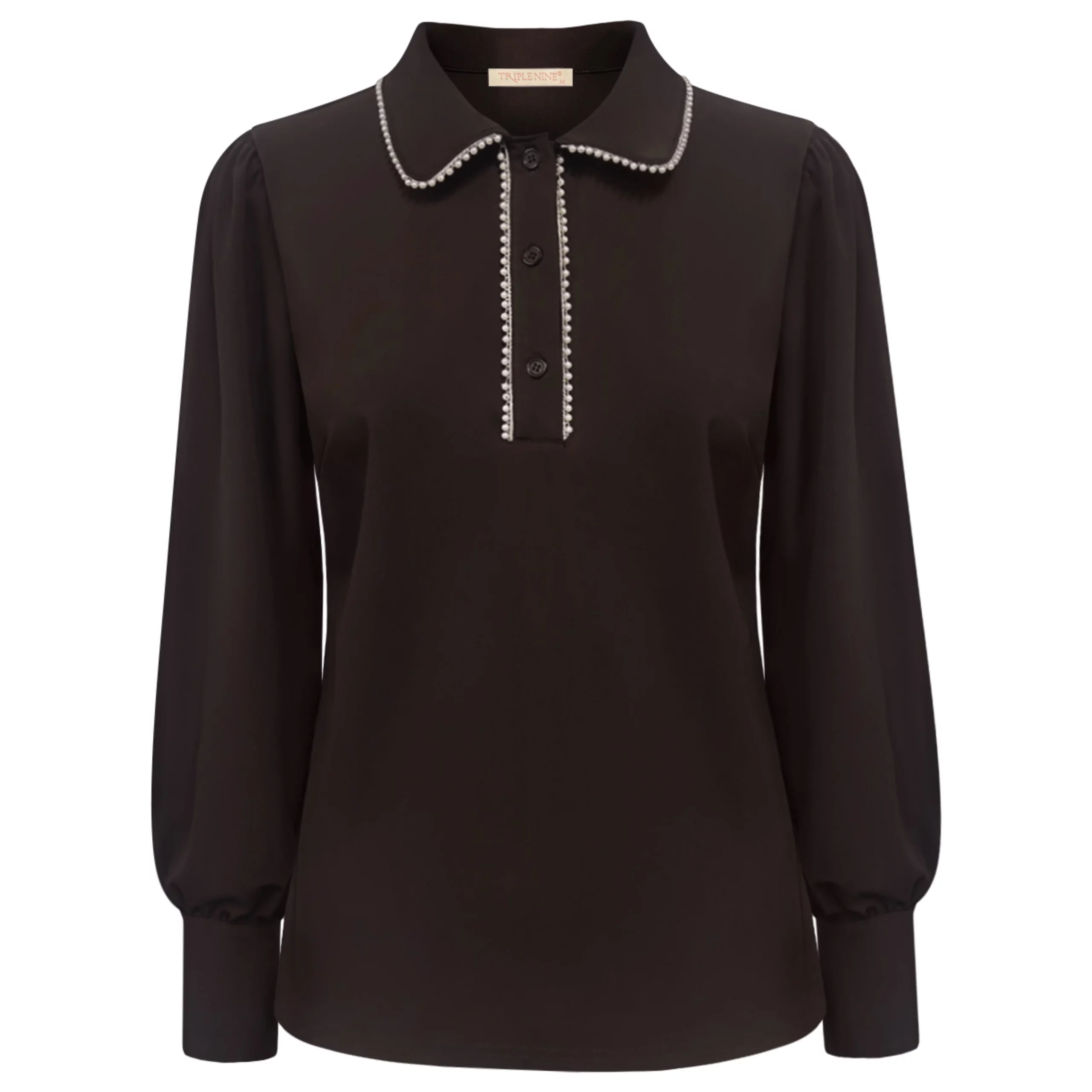 De blouse heeft een mooie kraag met een geborduurde parelrand welke doorloopt in de V hals met twee knopen.