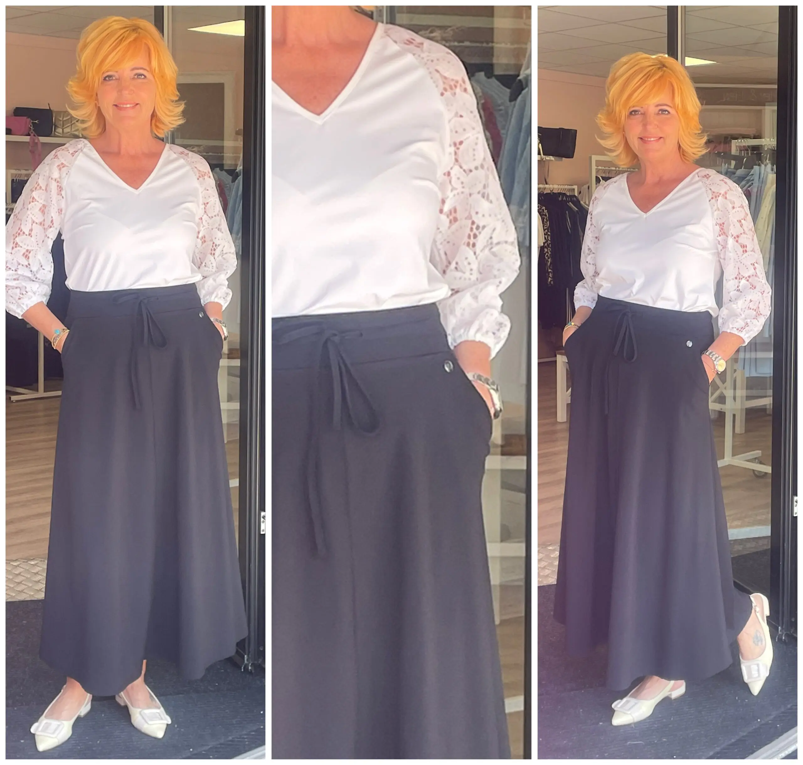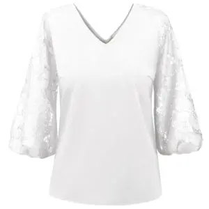 De Blouse is iets getailleerd en heeft 7/8 pofmouwen in kantlook met een elastieken boordje.