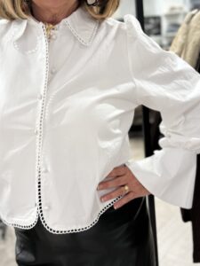 Frisse crispy katoen(mix), puntkraagje afgezet met borduursel. Dankzij de stretchy getailleerde kort fit en de leuke wijder uitlopende pofmouwtjes die je eventueel bij de pols kunt strikken, draagt dit bloesje feminien en stijlvol stoer tegelijk.