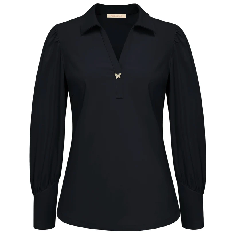 Blouse met kraag en v-hals welke eindigt met een sierlijk vlinder knoopje.