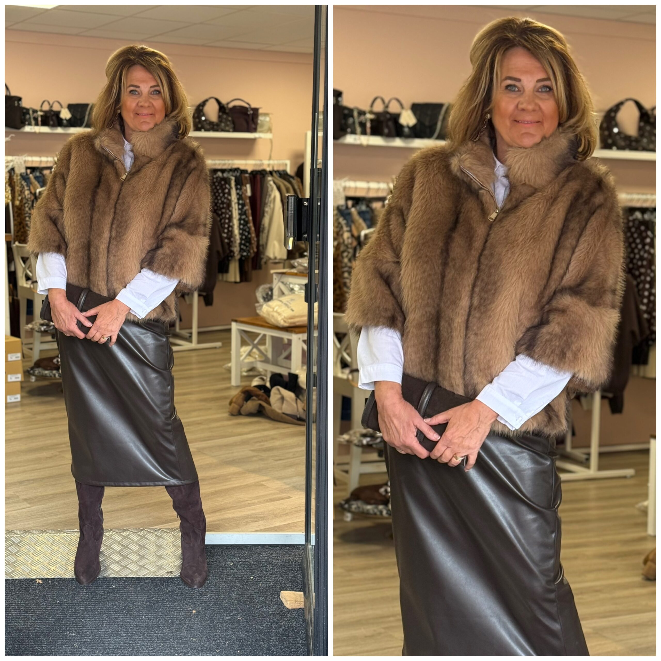 Dit jasje in cape model in bruin zacht imitatiebont, draag je over een mooie trui of over een mooi tussendoor jasje.