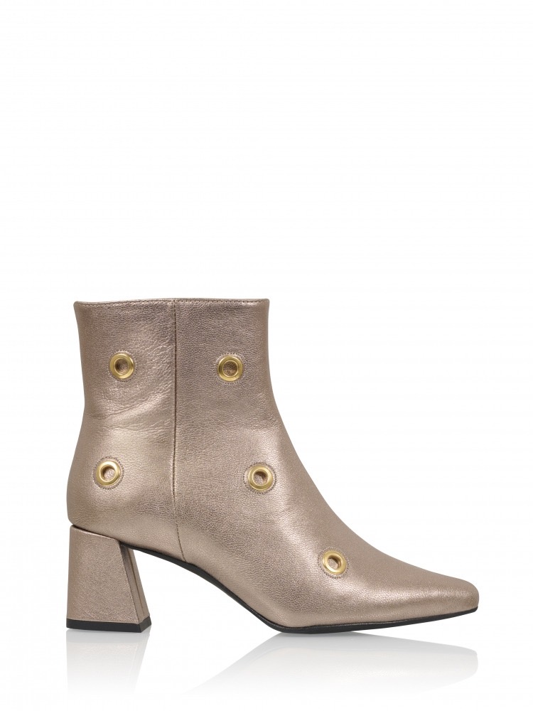 Deze enkellaarsjes met blokhak zijn aan de buitenkant gemaakt van metallic en aan de binnenzijde van leer.