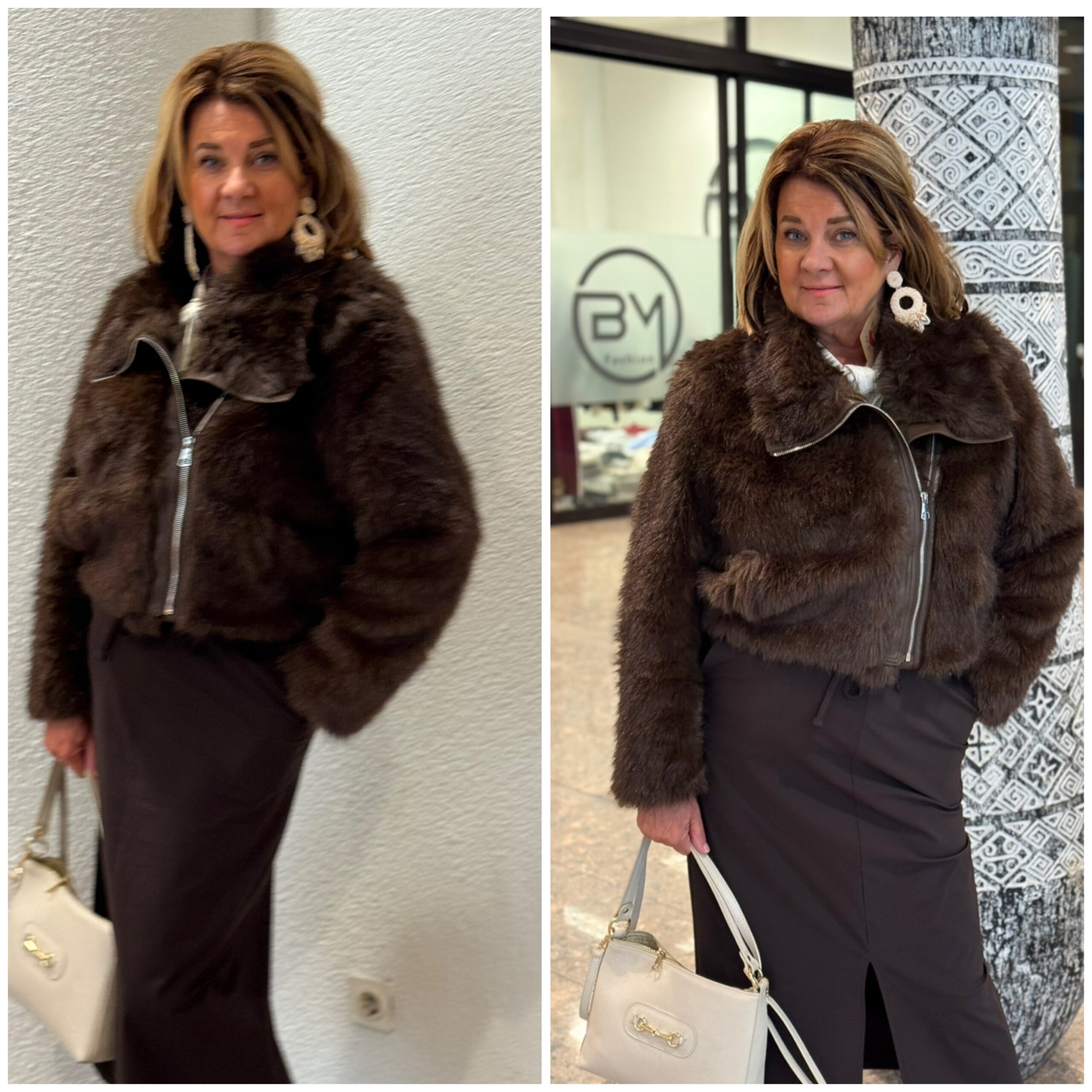 Uitgevoerd in in het bruin straalt dit korte jasje luxe uit door de zachte faux fur en de leatherlook details en schuine rits.