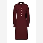 De jurk heeft een v-hals kraagje dat sluit met gouden knoopjes, het jurkje is aan de bovenkant iets getailleerd.