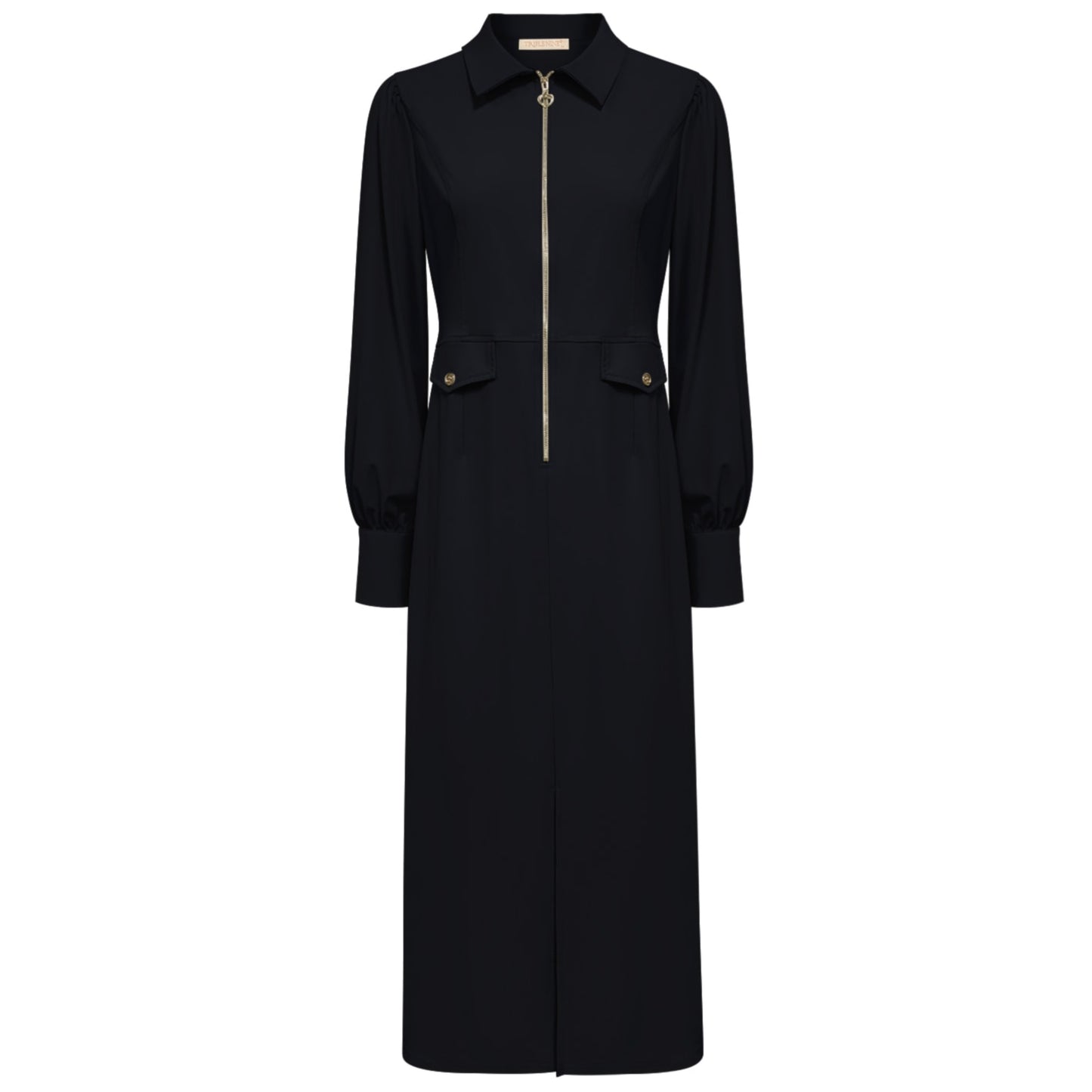 De jurk heeft tot halverwege de jurk een gouden rits en nepzakjes met gouden knoopjes en een korte split onder aan de jurk
