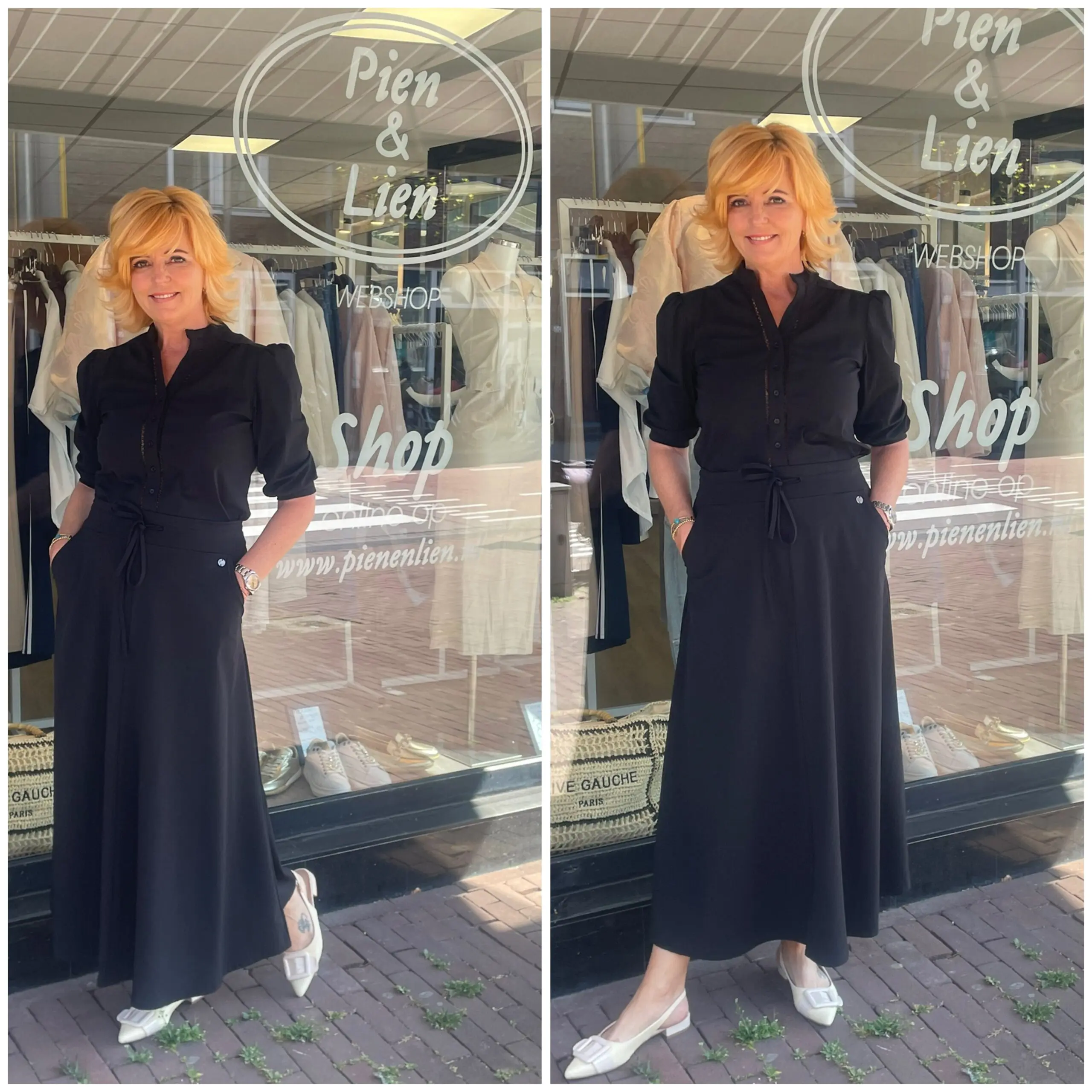 De rok heeft steekzakken en een brede band aan de bovenkant met een tunnelkoordje.