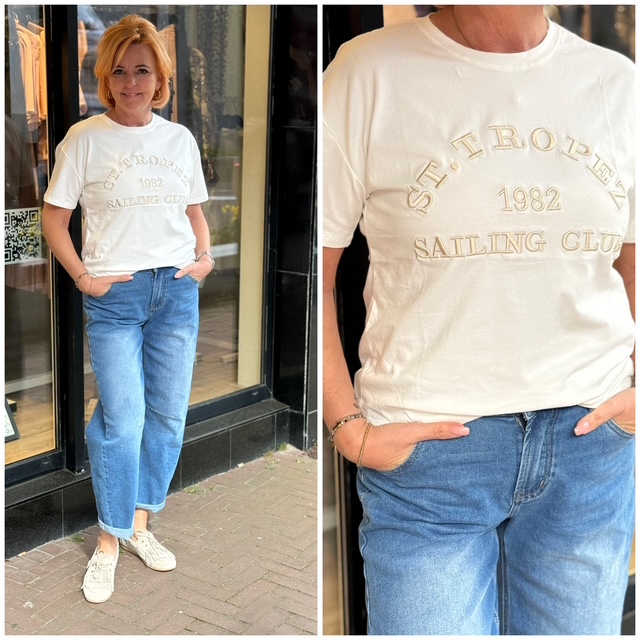 T-shirt in offwhite met prachtig licht goud kleurig borduursel.