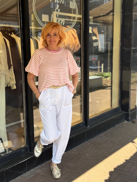 Gestreept t-shirt in een mooie kwaliteit katoen met stretch stof en een leuk pofmouwtje met elastiek.