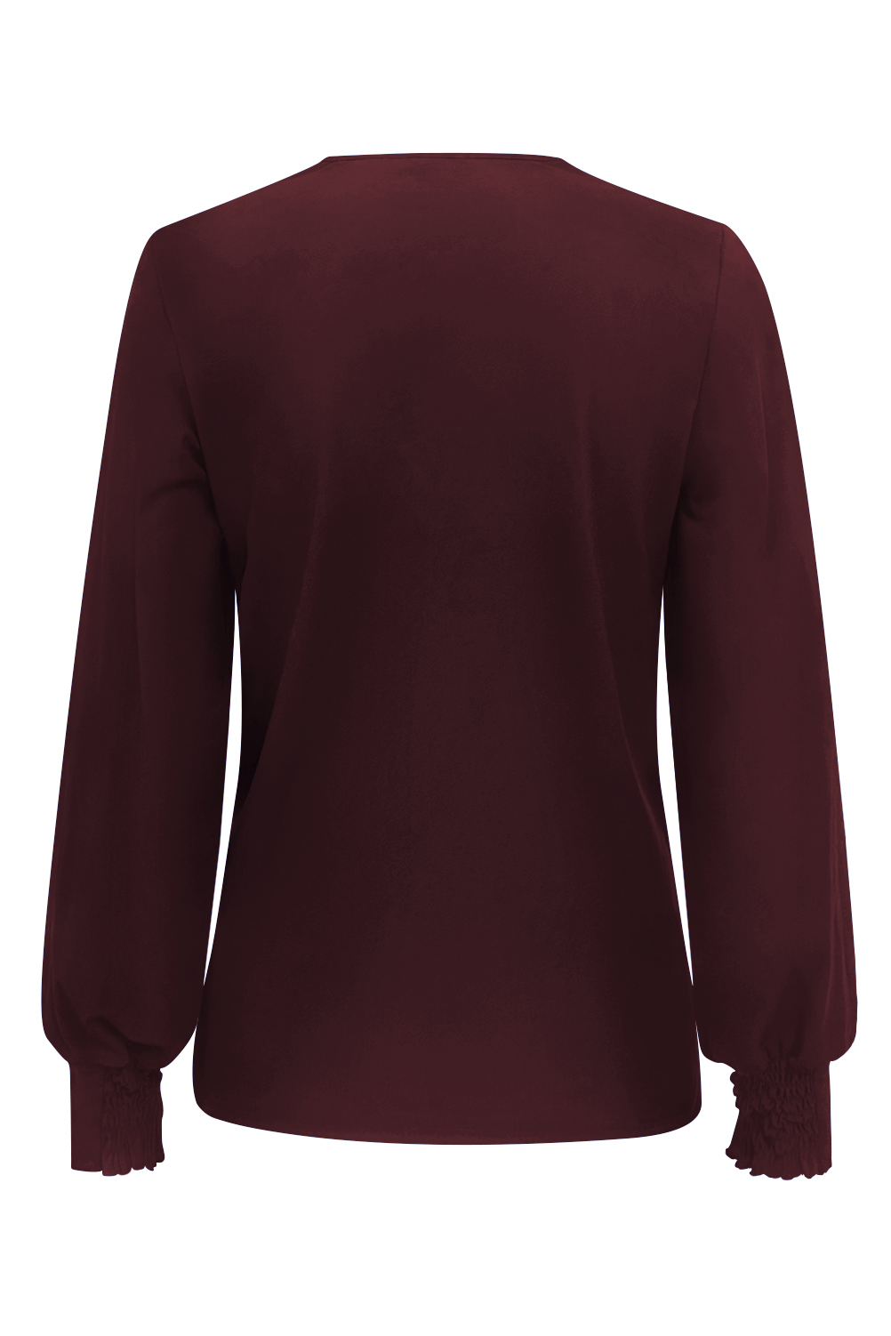 De top heeft lange mouwen met een half gesmokt manchet aan de uiteinden van de mouw.