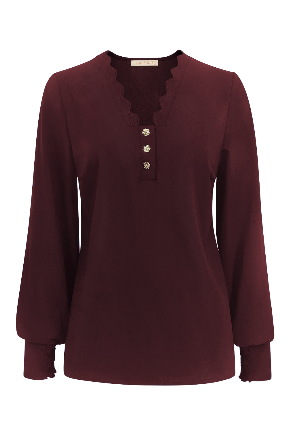 Mooie stijlvolle top met v-hals waarlangs een sierlijk geschulpte elastische rand loopt die eindigt met drie gouden knoopjes.