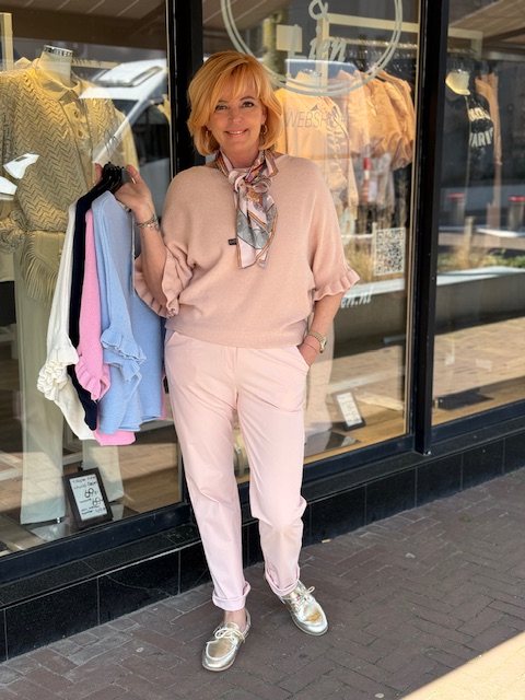 De trui heeft een boothals en een 3/4 mouw met een leuk ruche Verkrijgbaar in verschillende kleuren.