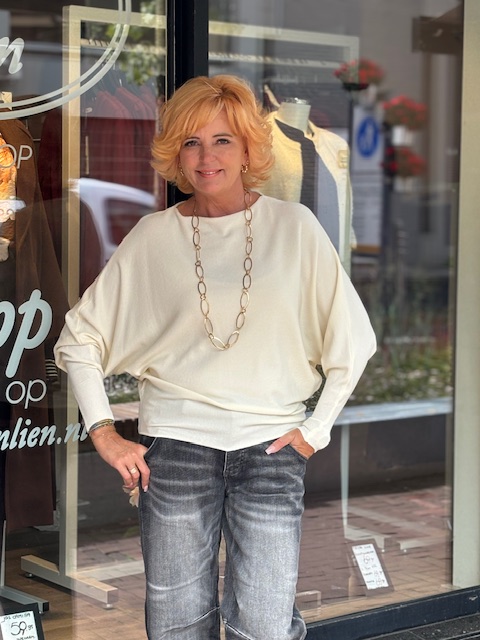 Ruimvallende trui in zacht/dun breisel met vleermuis mouwen.