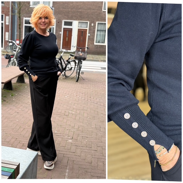 De trui heeft langs de mouw een rij metallic kleurige knoopjes.