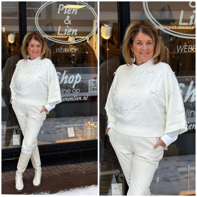 Nieuw binnen deze super leuke trui in mooi dun stretch breisel met leatherlook strikjes.