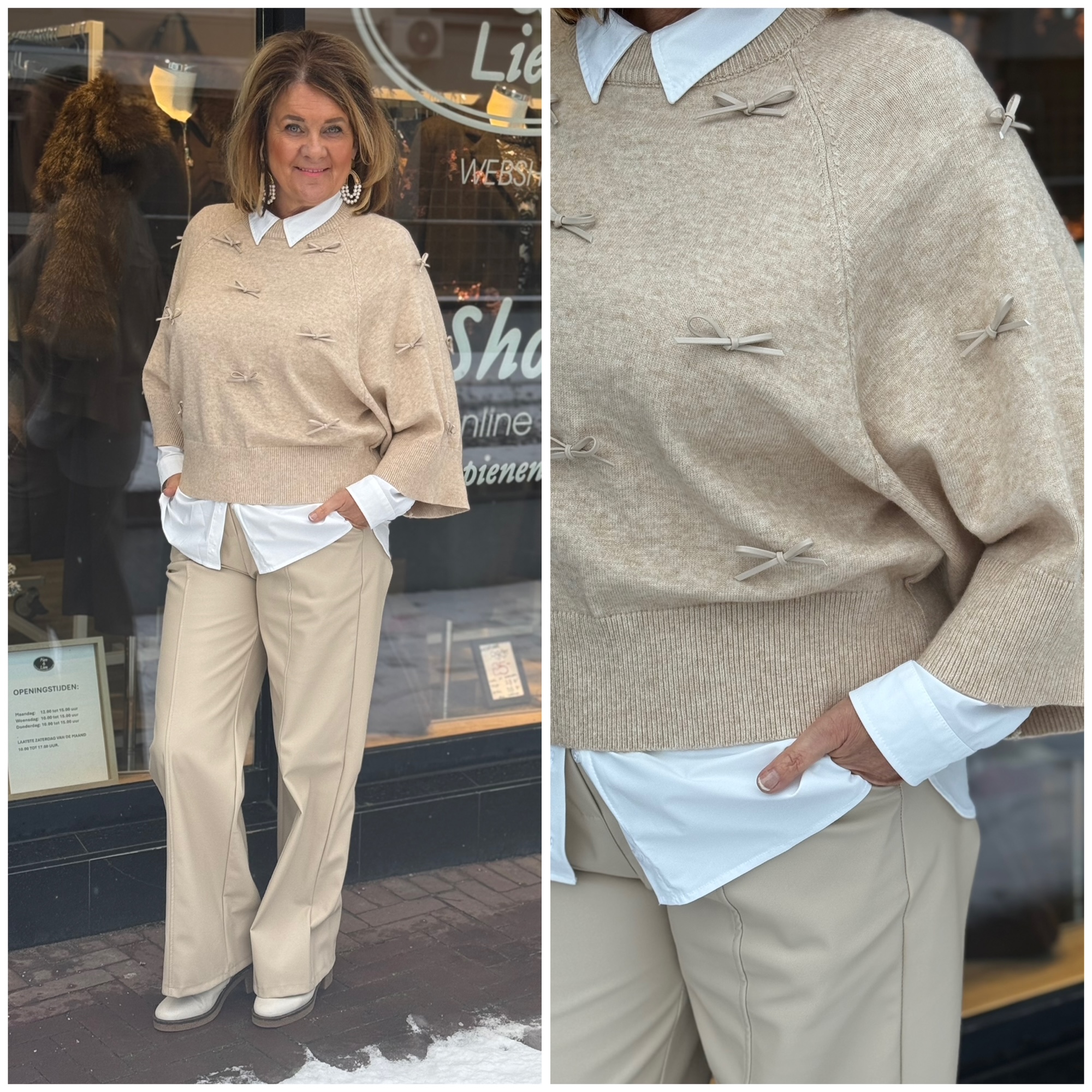 Nieuw binnen deze super leuke trui in mooi dun stretch breisel met leatherlook strikjes.