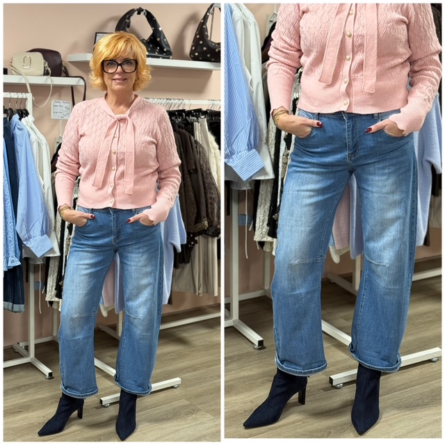 Nieuw binnen deze super leuke trui in mooi dun stretch breisel met leatherlook strikjes.