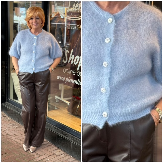 Prachtig ruimvallend vestje in Mohair met een mooi kort mouwtje om er een leuk blousje onder te kunnen dragen. En het vestje heeft mooie sierknoopjes voor een stijlvolle look.