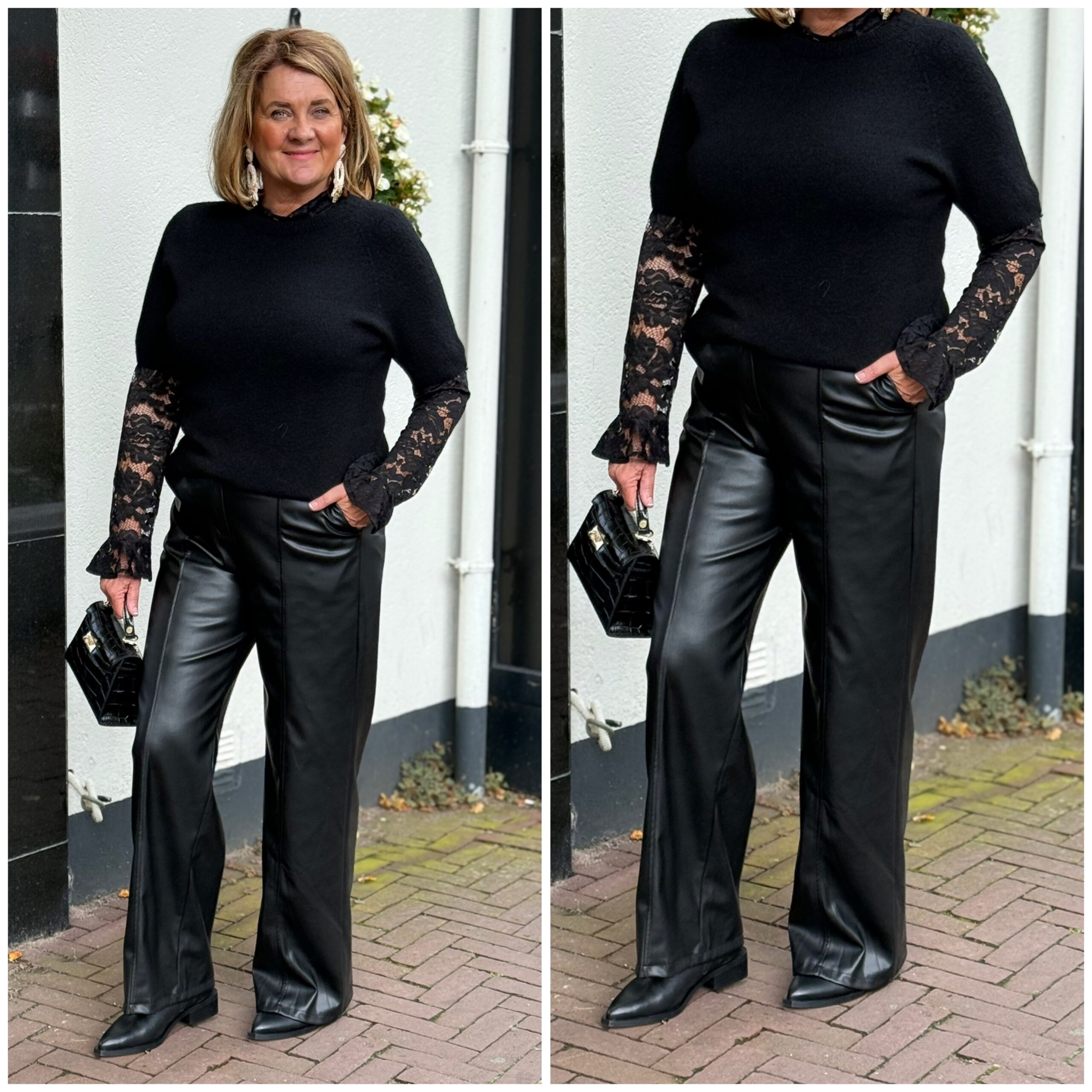 Deze imitatie leren broek in wide leg model met mooi siernaad, steek- en paspelzakken en een klassieke sluiting is een statement-item dat verrassend soepel draagt, door de mooie soepelvallende zachte imitatie leer.